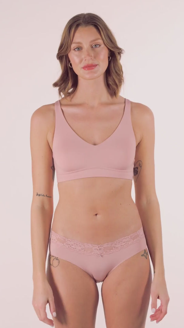 There’s nothing more convenient than this cup-sized bralette for everyday wear. This no-show bra was designed with removable pads and a smoothing silhouette. Dress it up or wear it as a statement piece with your fave loungewear. Features: • Removable pads • Adjustable straps • U-back shape • Wire-free • Ethically made Fabric: 85% Nylon, 15% Spandex. Washing Instructions: • Hand wash OR machine wash cold in mesh bag on gentle cycle. • Lay flat to dry. Style #9335