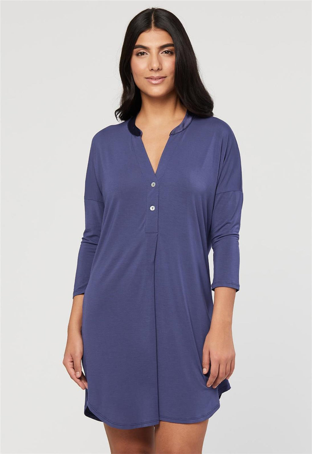 This feminine take on the traditional nightshirt blends comfort and style for a look you’ll love. Made from sustainable material, our nightshirt is incredibly soft and breathable, and washes easily without pilling or shrinking. The delicate mandarin collar, ¾ length sleeves, and pearlescent buttons create the perfect look for the modern sleeping beauty. Features • TENCEL™ Modal - Micro fibers • Mandarin silk Charmeuse collar • ¾ length sleeves Designed by women. Sustainably sourced and ethically made. Main Fabric: 94% TENCEL™ Modal x Eco Soft technology, 6% Spandex. Care Instructions •Hand wash OR machine wash cold in mesh bag on gentle cycle. •Lay flat to dry. Style #6004